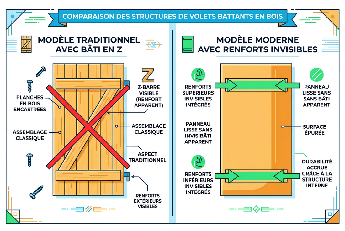 Alors oui, supprimer cette pièce sans rien prévoir à la place, c'est aller droit vers l'affaissement. Mais « sans rien prévoir », c'est la nuance qui change tout. Parce que les menuisiers fabriquent des volets lisses depuis des siècles, notamment en Provence et dans le Sud-Ouest. Ils ont simplement remplacé la triangulation par d'autres systèmes de rigidification. Et ces systèmes, les voici.