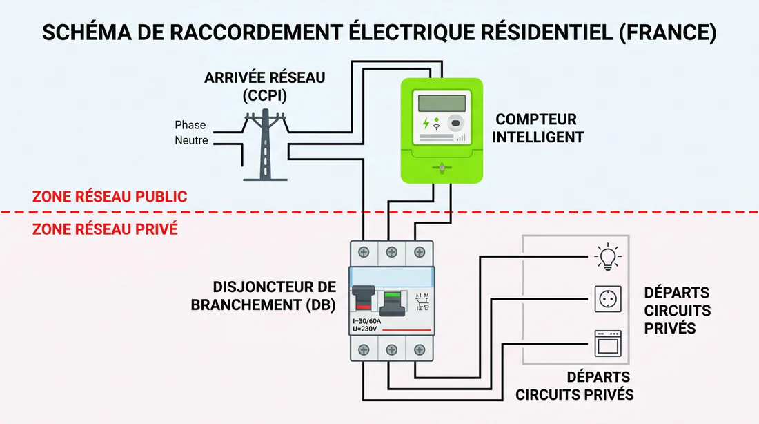 Vous voyez le schéma ? Tout ce qui est avant le disjoncteur de branchement, vous n'y touchez pas. Point. Ce n'est pas une recommandation, c'est la loi. Briser un scellé Enedis peut être assimilé à une tentative de fraude, avec les conséquences que ça implique (on y revient plus bas).